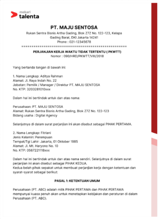 Kalau butuh contoh kontrak PKWTT, gambar di atas bisa jadi referensi. Kamu bisa memasukkan informasi seputar probation, benefit sebagai pegawai tetap, sampai kesepakatan tertentu sesuai kebijakan perusahaan.