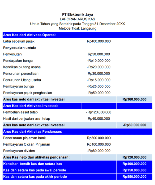 Laporan arus kas tidak langsung diawali dari profit sebelum pajak. Kemudian, ada penyesuaian transaksi non kas agar terlihat net cash flow dari kegiatan operasional, penanaman modal, dan pembiayaan.